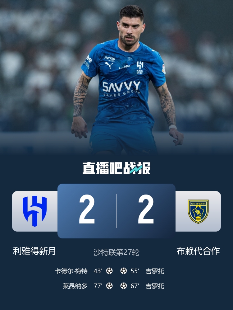 直播吧4月5日讯 北京时间4月5日2:00,沙特联赛第28轮,利雅得新月在利雅得王国竞技场迎战布赖代合作。上半场,梅特展现个人能力打破僵局;下半场,吉罗托两记头球帮助布赖代合作反超比分,莱昂纳多抢点扳平比分。最终利雅得新月在主场2-2战平布赖代合作。积分榜方面,利雅得新月积65分排名第二,布赖代合作积46分排名第五。
